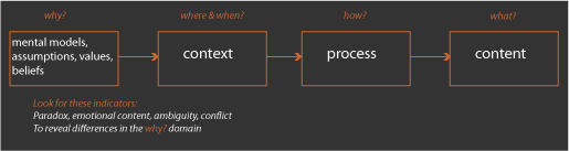 He asserted that these forces, the mental models, assumptions, values and beliefs are usually hidden beneath the context. The clues to their existence are paradox, emotional content, ambiguity and conflict in the process and its content.